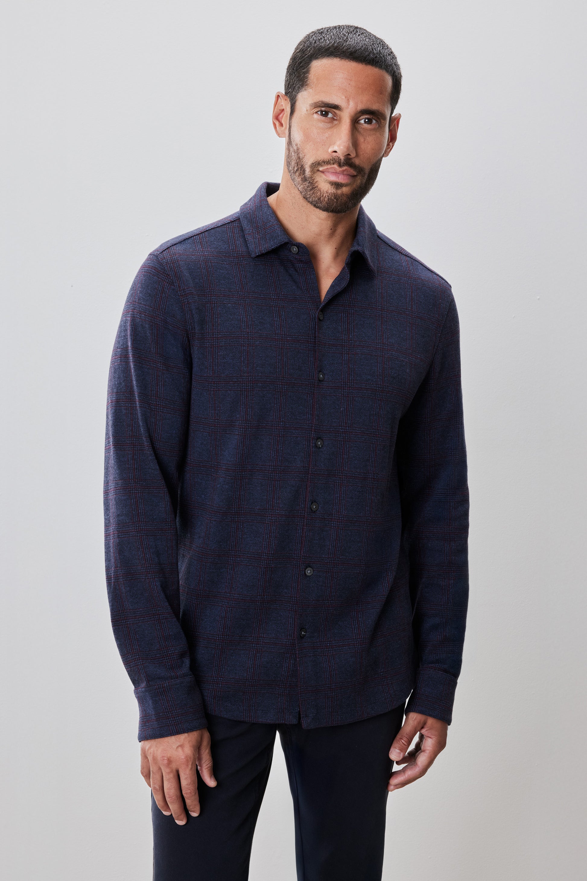 Designed for all-day ease, this sportshirt features a comfort knit fabric that offers added stretch and softness. The rich plaid brings a bold yet classic touch, while the versatile cut allows it to be worn tucked or untucked. A perfect blend of comfort, style, and flexibility.