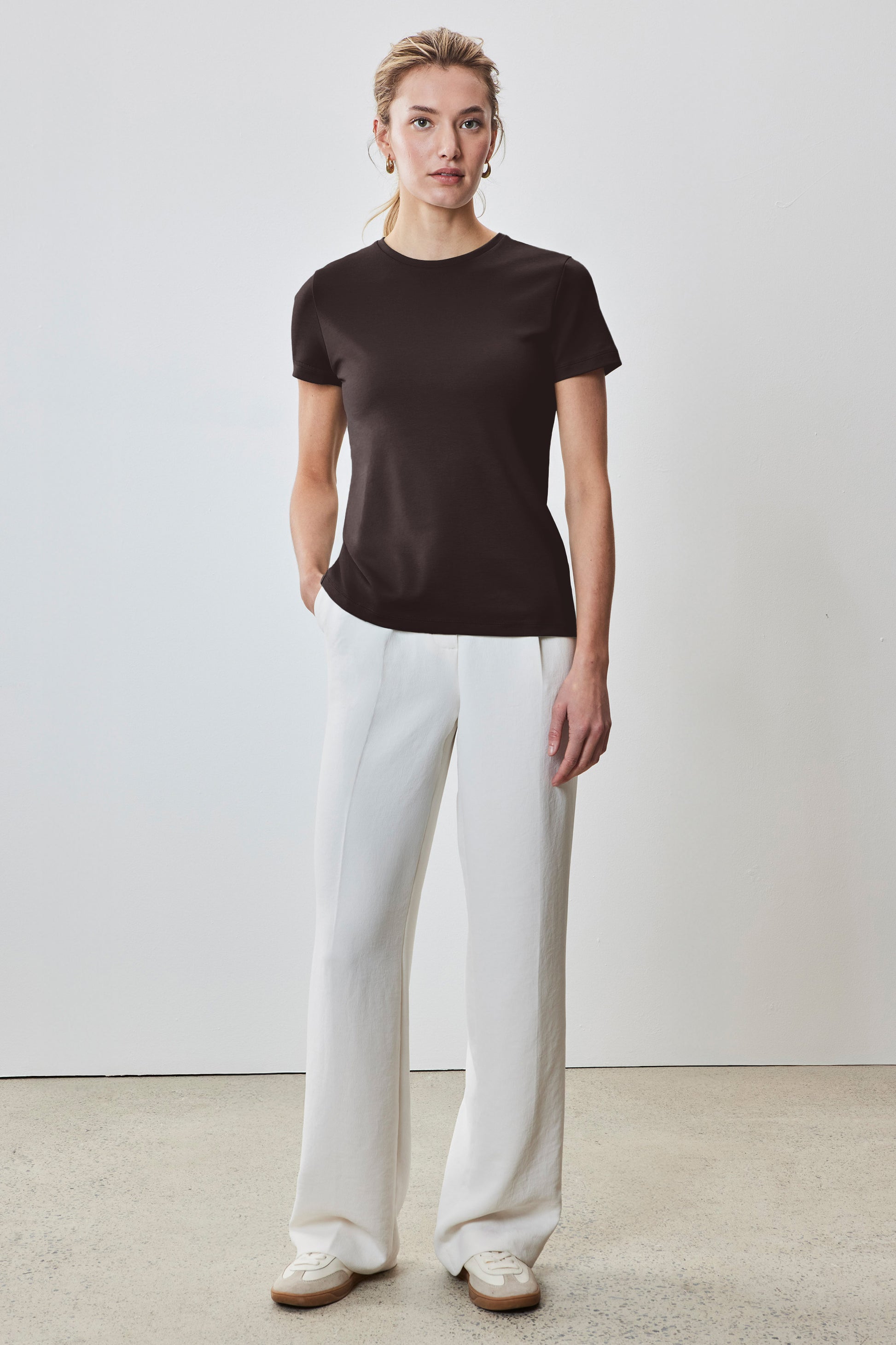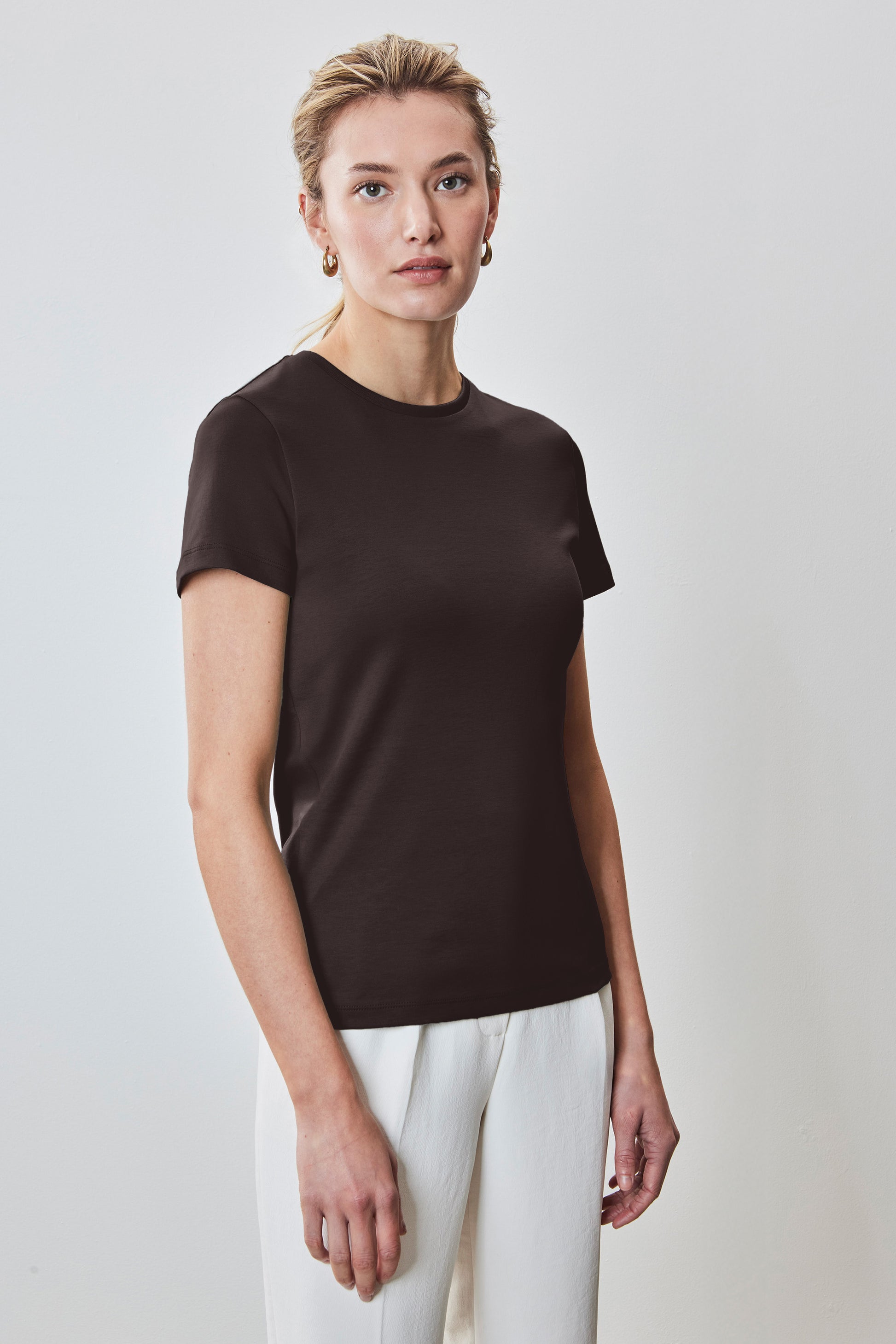 Introducing the Barakett Women's Tee. Featuring a more subtle neckline and a slimmer fit, our women's T-shirt is made with our exclusive USA-grown Pima Cotton and uses Soft Water finishing to create the ultimate in comfort, luxurious hand feel, and clean appearance. The best dressy T-shirt, it's great on its own or as a universal layering piece.