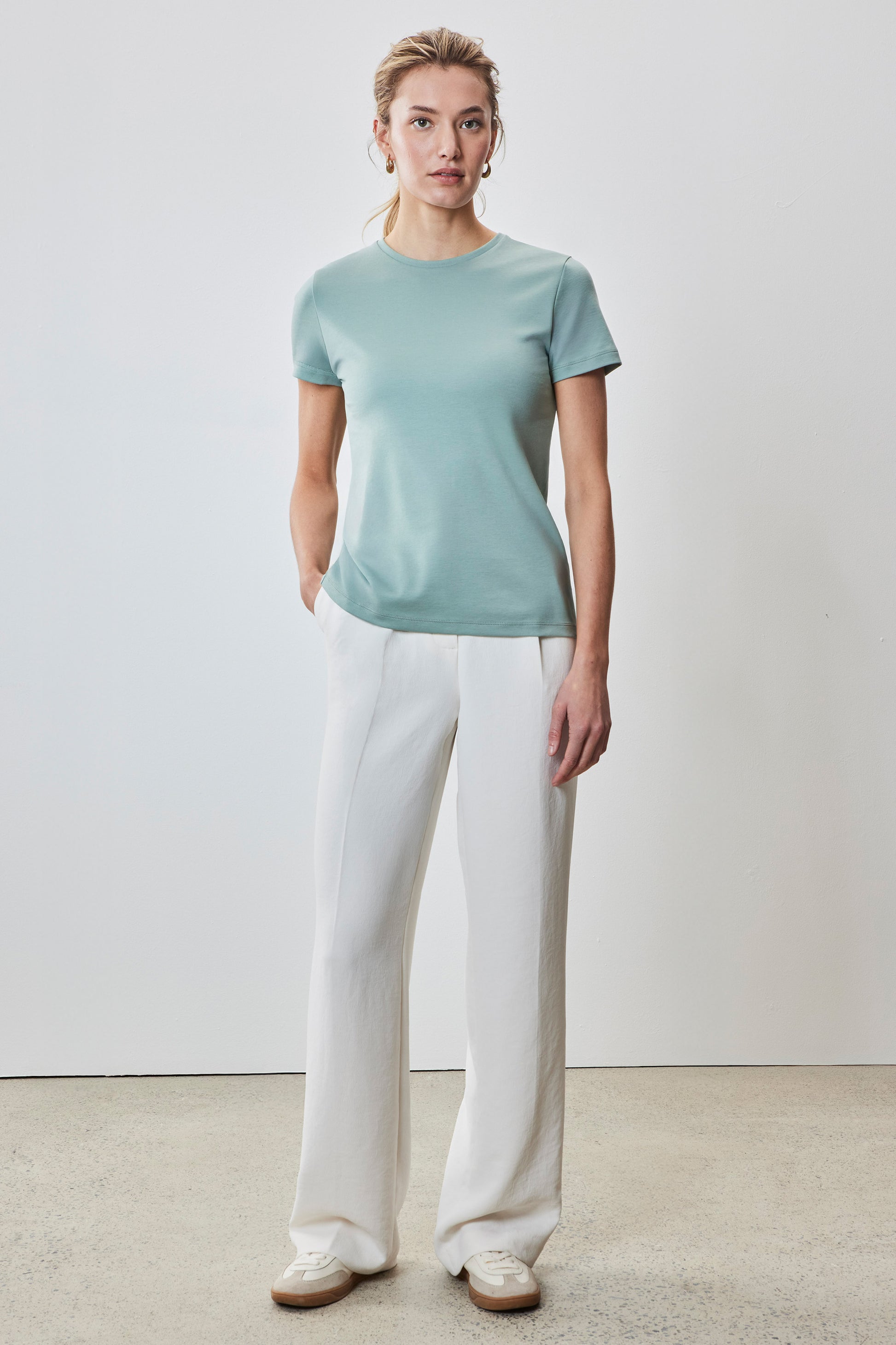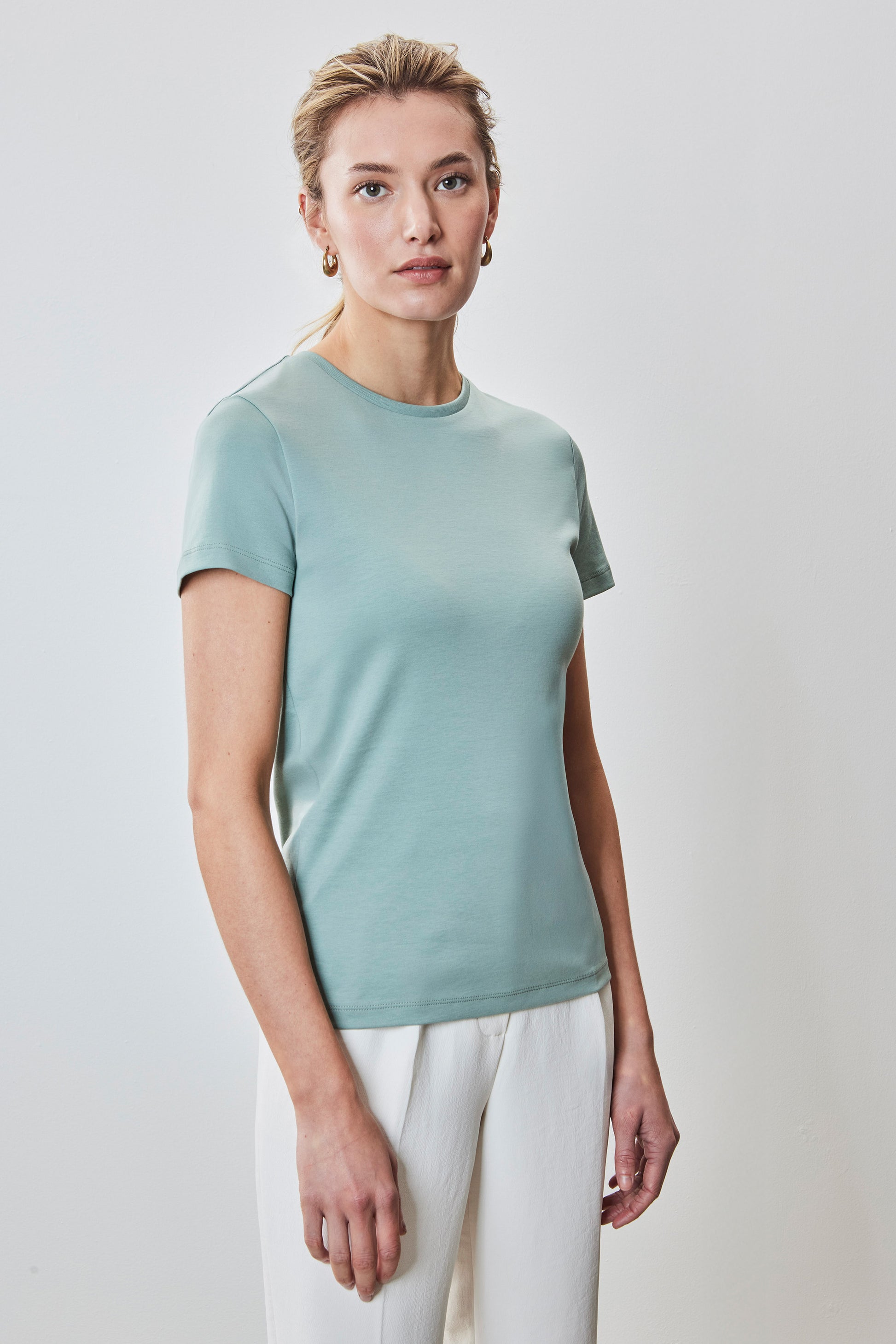Introducing the Barakett Women's Tee. Featuring a more subtle neckline and a slimmer fit, our women's T-shirt is made with our exclusive USA-grown Pima Cotton and uses Soft Water finishing to create the ultimate in comfort, luxurious hand feel, and clean appearance. The best dressy T-shirt, it's great on its own or as a universal layering piece.