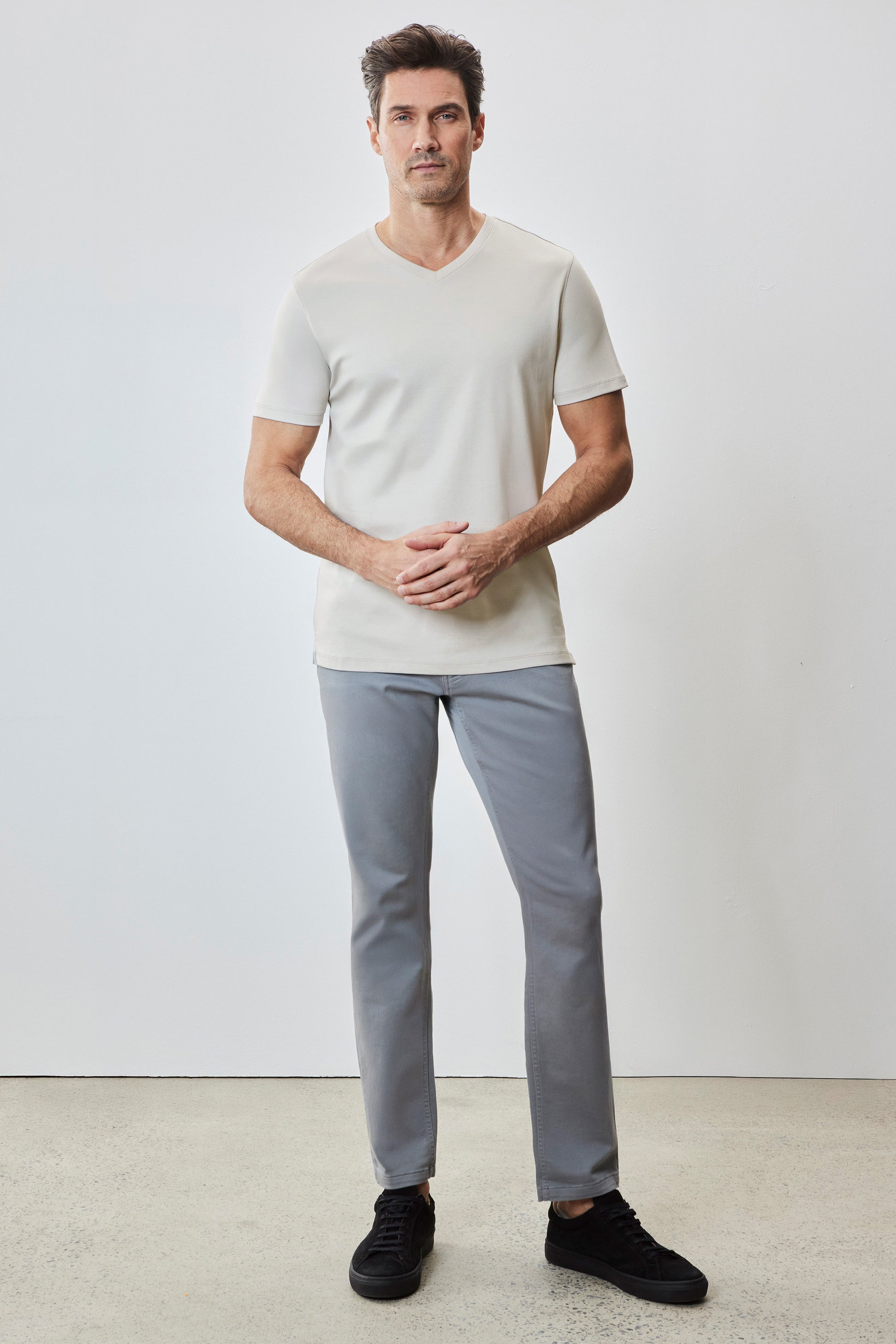 Also known as the Georgia V-neck T-shirt. It is the equally comfortable and stylish brother of The Barakett Tee. Made with our signature Pima cotton fabric with Soft Water finishing, it's the ultimate in comfort, luxurious hand feel, and clean appearance. A versatile piece in any man's wardrobe; elevate any look with the most comfortable V-neck ever.